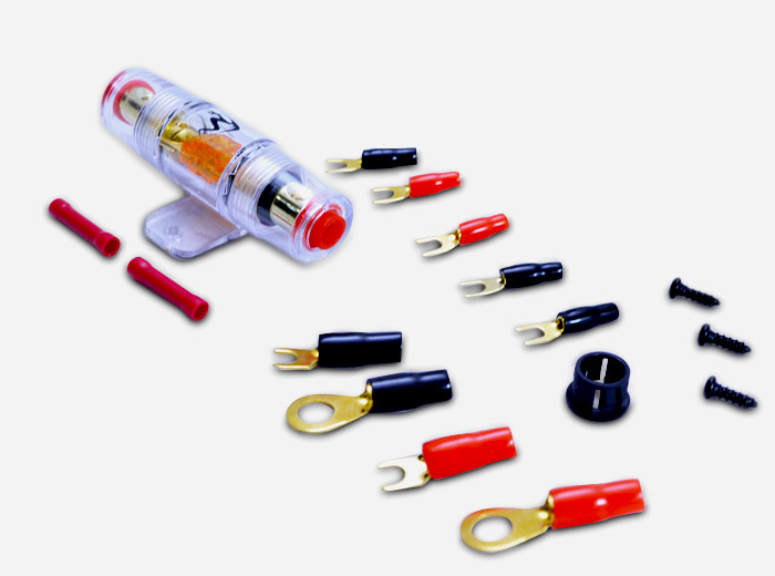 1 porta fusible mini anl, 1 rca 4.50 mts, 5 mts calibre 8, 90 ctms de tierra, 15 mts calibre 16, terminales y accesorios.